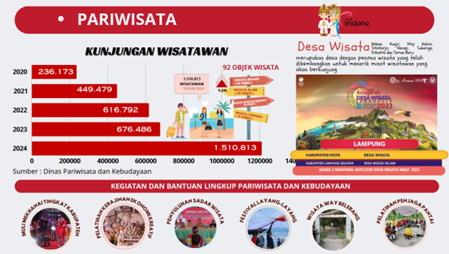 Infografik pariwisata Kabupaten Lampung Selatan menunjukkan peningkatan signifikan jumlah kunjungan wisatawan dari 236.173 orang pada tahun 2020 menjadi 1.510.813 orang pada tahun 2024, menandakan pertumbuhan lebih dari enam kali lipat dalam lima tahun terakhir. Capaian ini didukung oleh pengembangan 92 objek wisata yang terdiri dari wisata bahari, alam, dan terpadu, serta penguatan desa wisata seperti Desa Wisata Kelawi yang berhasil meraih Juara 2 Nasional Kategori Desa Wisata Maju Tahun 2023. Selain itu, terdapat 17 destinasi unggulan seperti Slanik Waterpark, Pantai Minangrua, Grand Elty, dan Way Belerang yang menjadi daya tarik utama wisatawan. Pemerintah daerah juga aktif melaksanakan kegiatan pendukung seperti pelatihan ekonomi kreatif, festival budaya, dan penyuluhan sadar wisata, yang secara keseluruhan berkontribusi pada meningkatnya daya saing sektor pariwisata dan kebudayaan di Lampung Selatan.